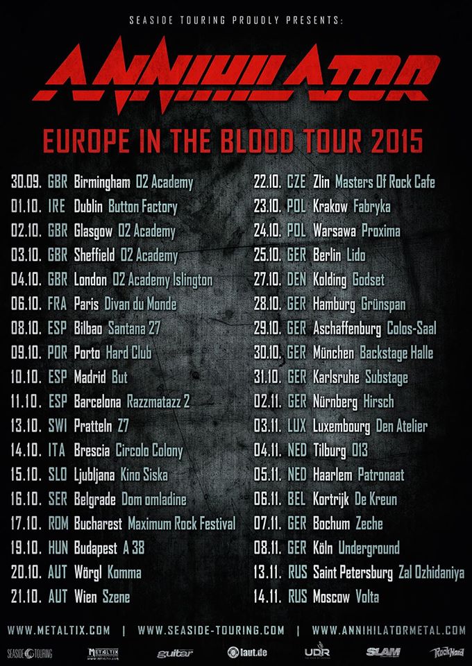 ANNIHILATOR have announced an european tour for the Fall of 2015. It starts at the end of September in the UK and ends on the 14th of November in Russia. This tour has a single date in Portugal, on the 9th of October, in Porto. You can see the full tour dates bellow. More informations regarding the tour dates, venues and tickets should be disclosed soon.