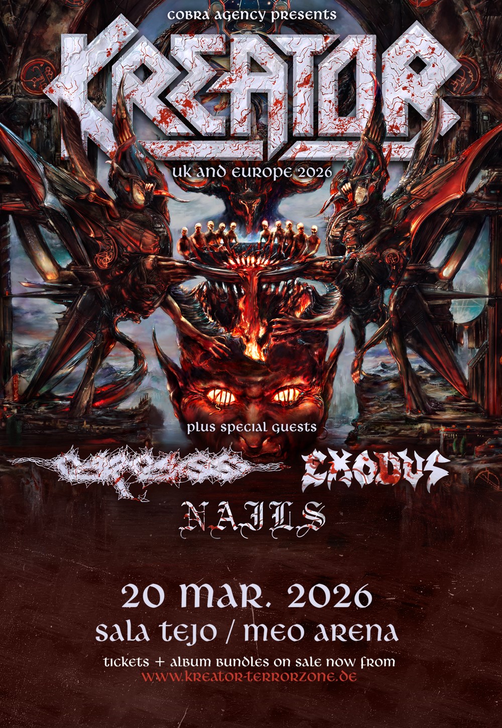 The KRUSHERS OF THE WORLD TOUR arrives in Portugal in March 2026 with KREATOR, CARCASS, EXODUS, and NAILS.