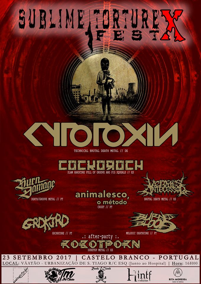 They will be joined by Cockoroch, Vermis Antecessor, Burn Damage, Animalesco o Método, Burned Blood and GRDKJRD. The after-party will be assured by the Spanish Dubstep Metal act Robot Porn.