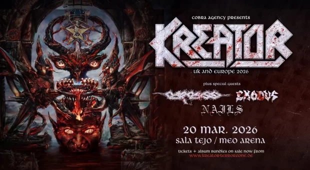 The Krushers of the World Tour arrives in Lisbon in March 2026, uniting Kreator, Carcass, Exodus and Nails for a one-night event at the Sala Tejo of MEO Arena, promoted by Prime Artists.