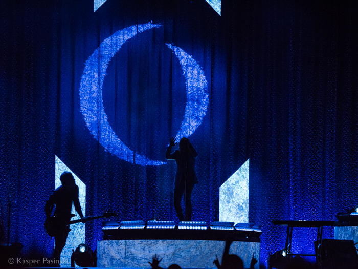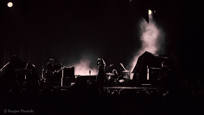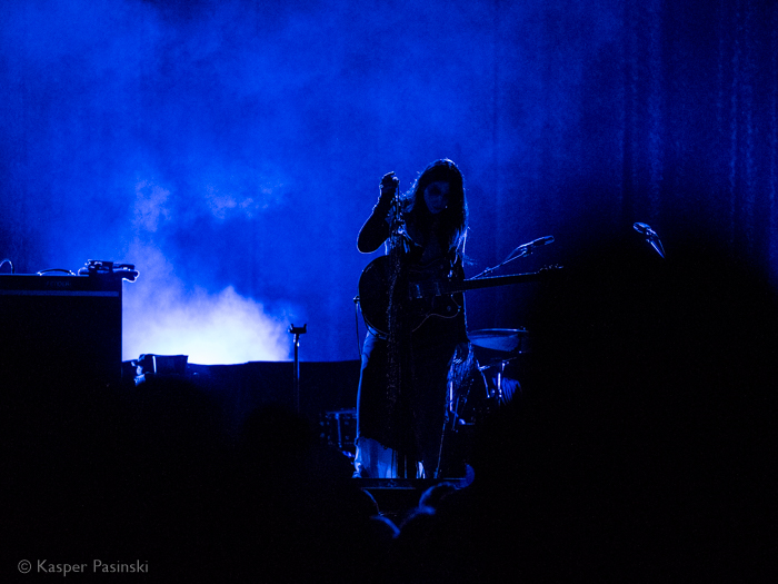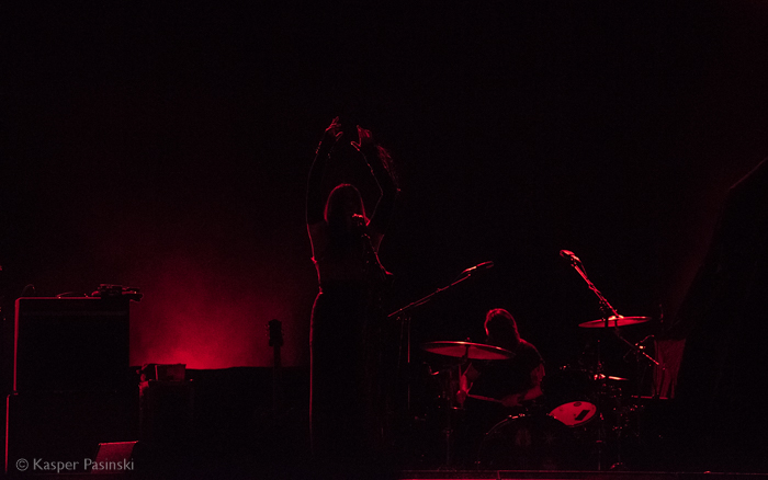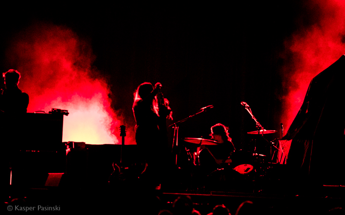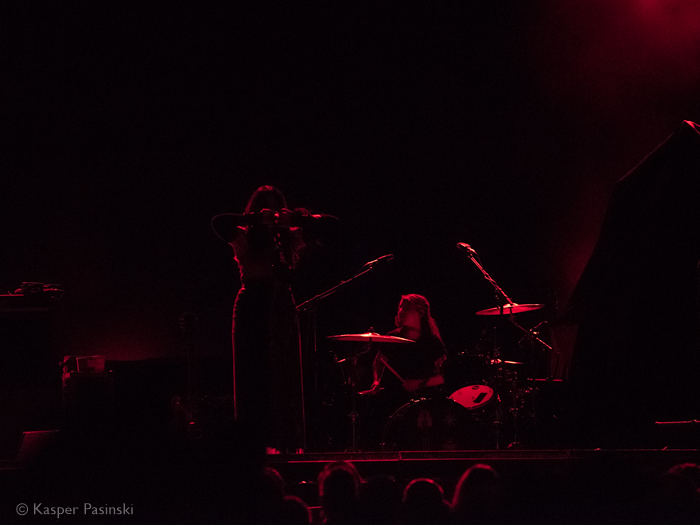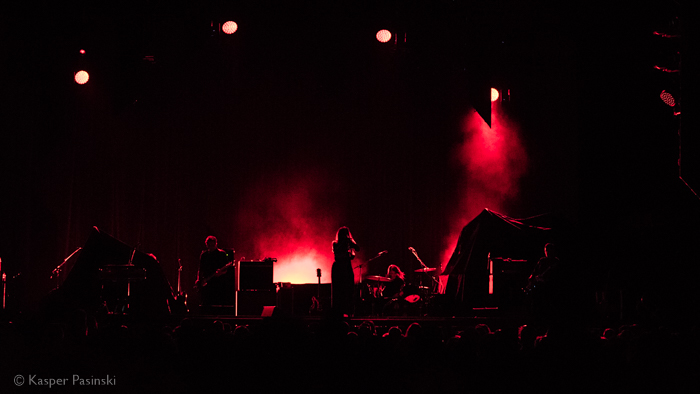 The opening act for the evening was no one else than the amazing Chelsea Wolfe. Her performance started on a barely lit stage, with minimal red lights breaking the darkness. The first notes of ‘Feral Love’ with the fast drum machine rhythm and a slowly raising voice traveled through the venue. ‘Spun’ was played next, and here Chelsea played her hollow body guitar, a lot of fuzz and distortion created a very atmospheric ambience. The performance continued in similar mood with the following songs. The total lack of light that was witnessed for the bigger part of the show was an additional factor to create an intimate atmosphere inside the venue. Chelsea closed the show with ‘Survive’ and ‘Scrape’ leaving the stage for the main act of the evening. Chelsea Wolfe ‘s performance was top class and from what could be hear in crowd discussions, very well received by those who never heard about her previously.
