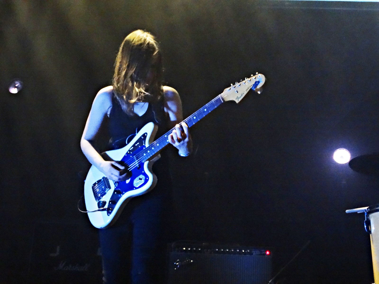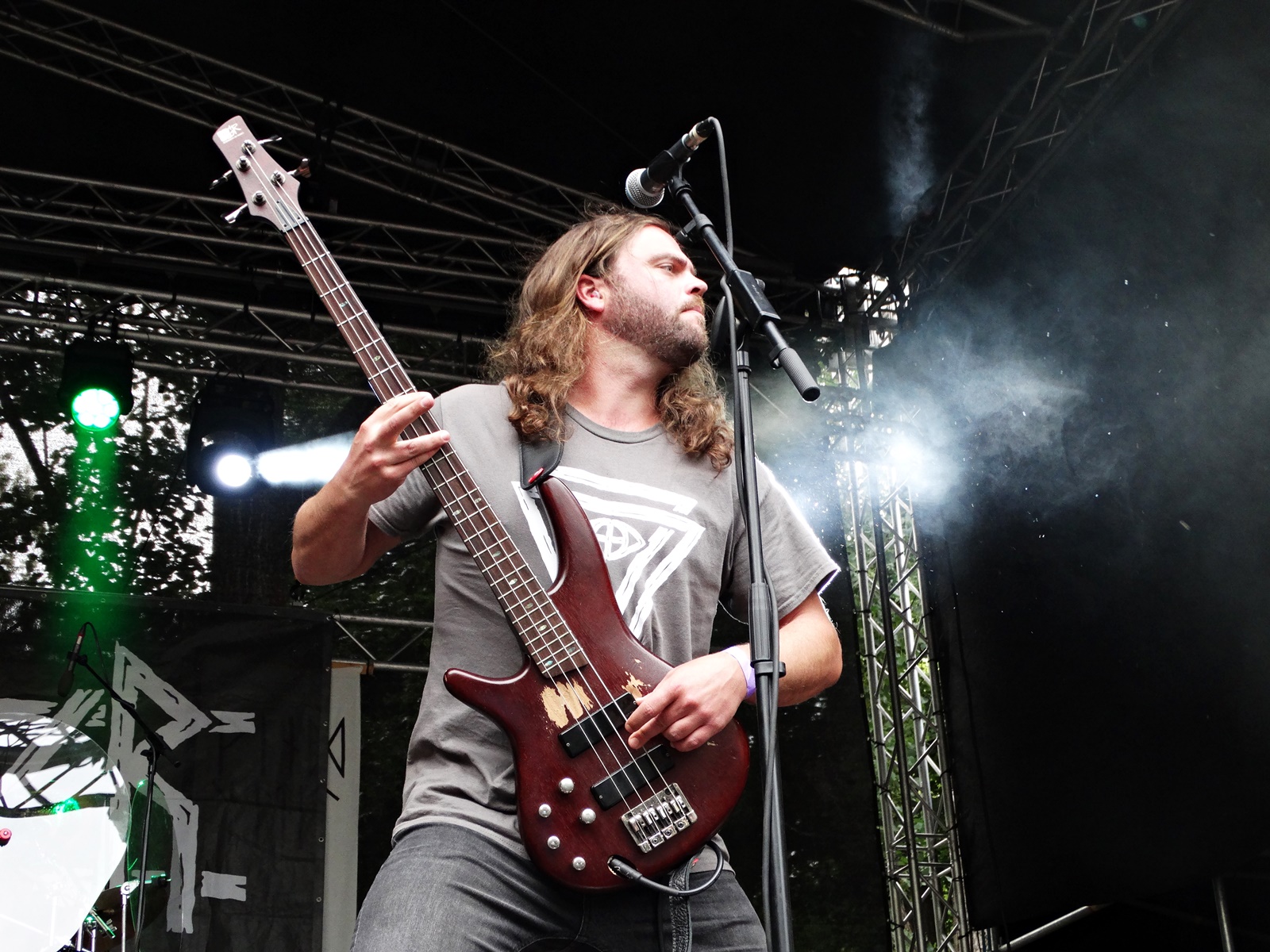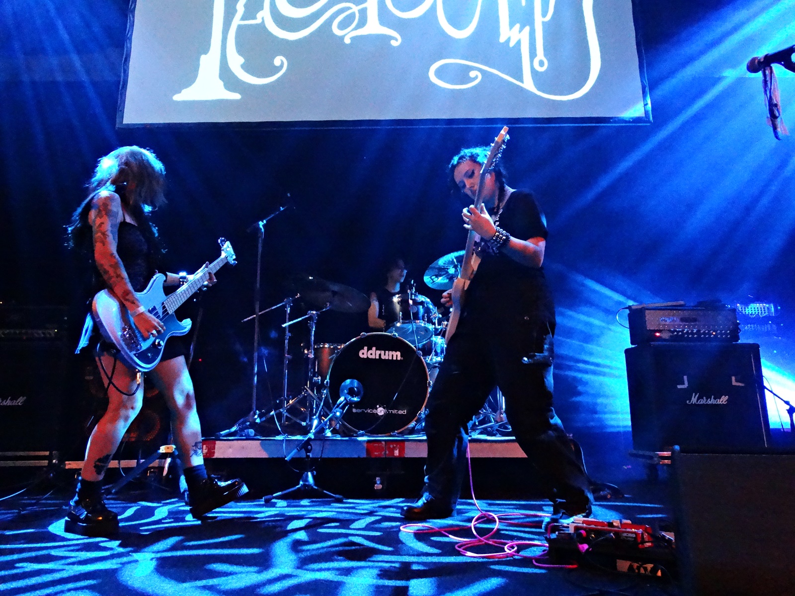 The first band to play was Faetooth, an American sludge/doom/post-metal band of three young women. We have to say that the sound barrier created by the three band members was intense. The distortion was so intense that the wooden floor seemed to vibrate beneath our feet. (the pool area was covered with wood). They played some songs from their first album (like “She Cast a Shadow,” “Echolalia”, “La sorcière”…) and some new songs that will be released on a new album later this year.