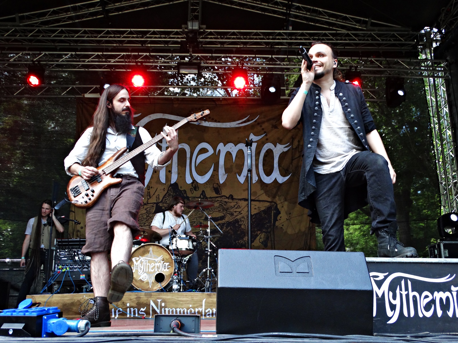 The first band we saw take the stage was Mythemia, a German folk-rock band whose songs deal with fantasy and medieval times. Although they had already released three albums, the setlist was based on their last two. After a brief intro, “Wechselwind,” “Nymphenquelle,” “Nimmerland,” “Feenstaub,” “Der Barde” (the only song from their first album they played), “John Ryan’s Polka,” “Phantom,” “Absturz,” “Setzt die Segel,” and “Nebelmeer” energized the crowd. As it was still a bit early, the venue wasn’t full. But this gave the audience more space to dance and let loose spontaneously to the cheerful folk music.